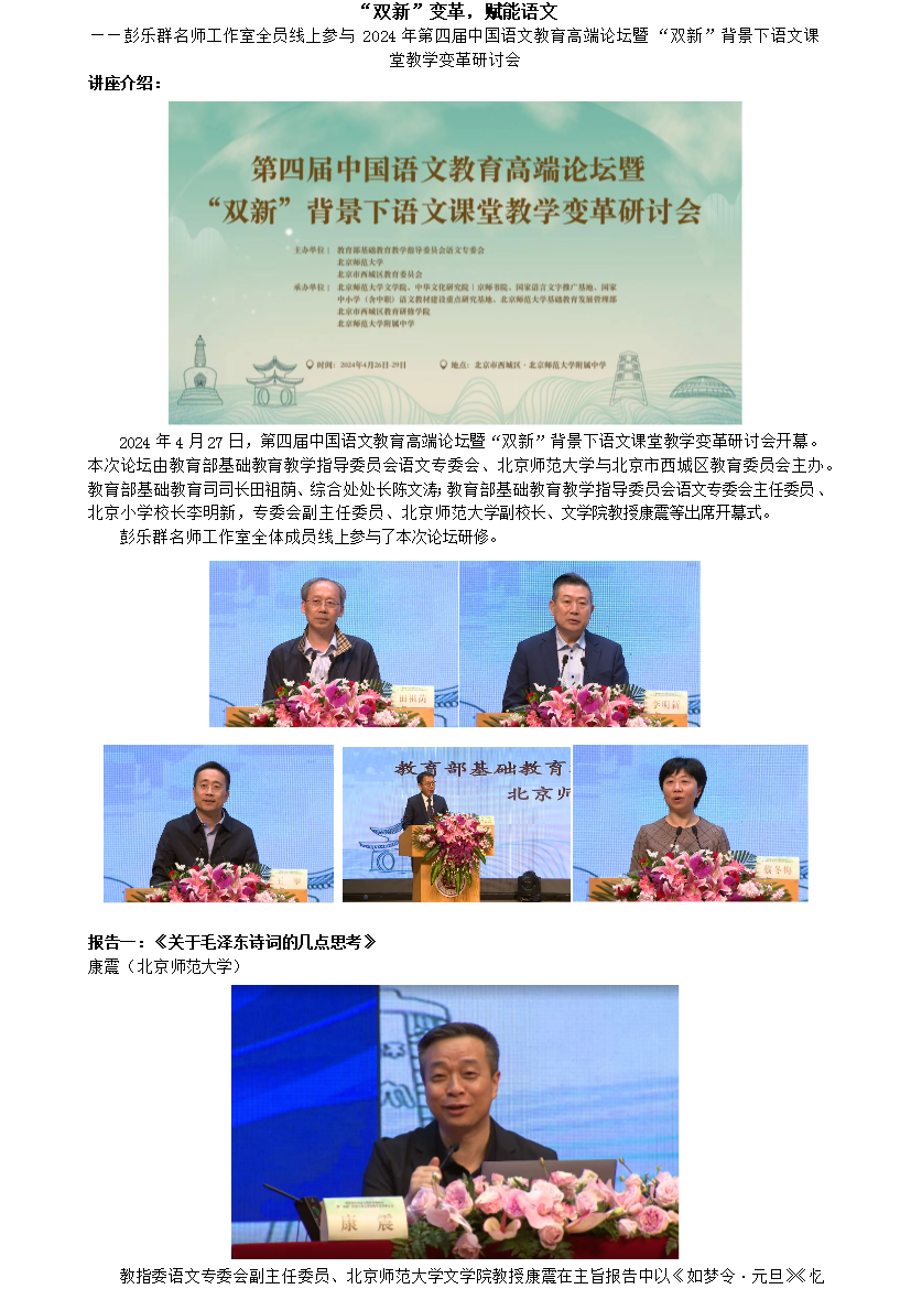 彭乐群名师工作室全员线上参与2024年第四届中国语文教育高端论坛暨“双新”背景下语文课堂教学变革研讨会