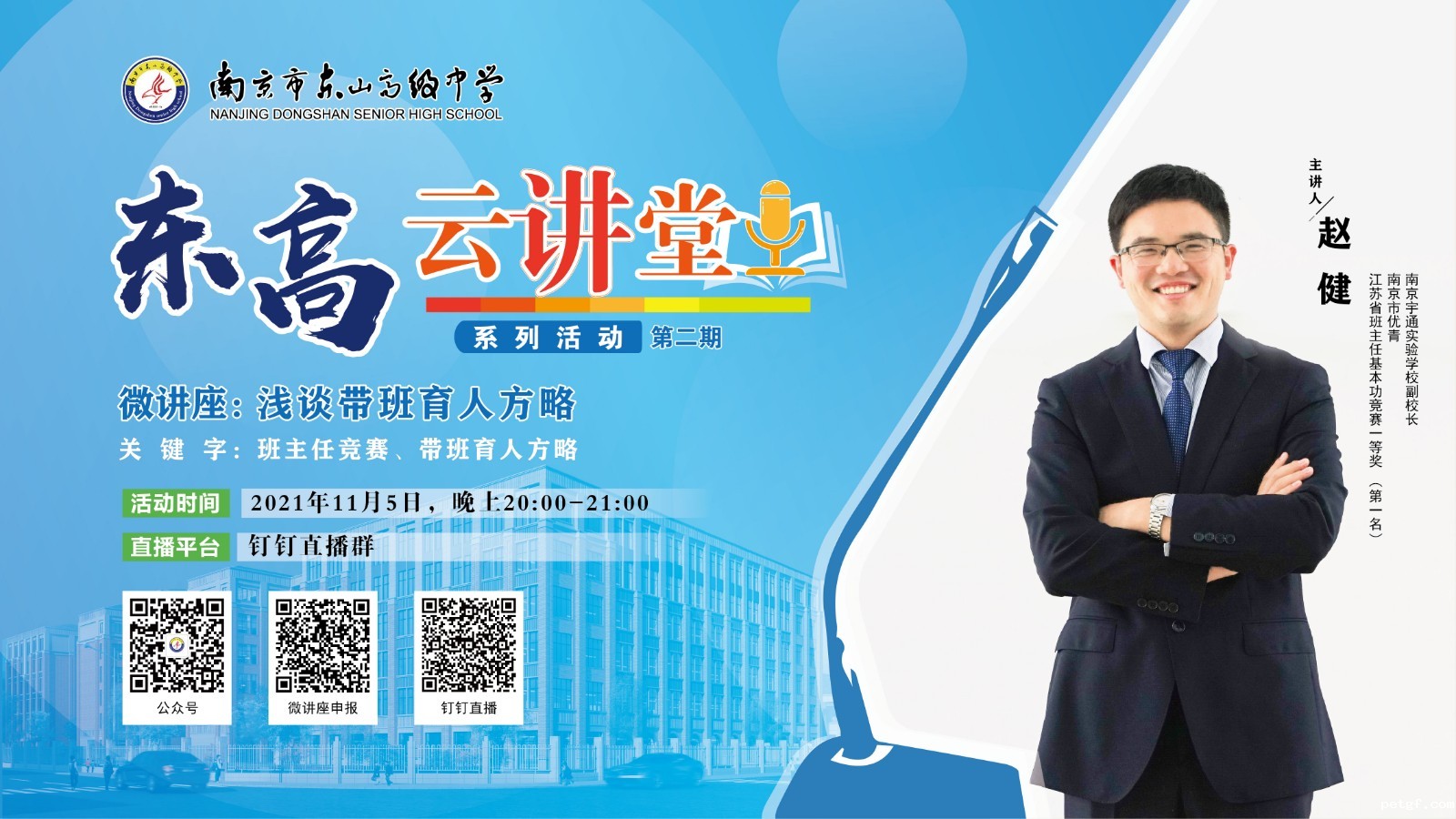 2021.11.6,东山高级中学组织了第二期《东高云讲堂》培训,本期主题为《带班育人方略》,东高三个年级的班主任线上、线下同步参与培训,来自南京宇通实验学校的赵健老师主讲,赵健老师是南京宇通实验学校副校长、南京市优青、江苏省班主任基本功竞赛一等奖 (第一名),带班经验与比赛经验丰富。他首先分析了班主任比赛的组织、内容与准备的注意事项,然后列举具体案例介绍内容的选择、凝练与文本撰写。赵老师清晰、细致的分析让大家对于比赛流程、内容与路径有了清晰的认识,同时也对班主任工作有了更为深入的理解,大家收获满满。