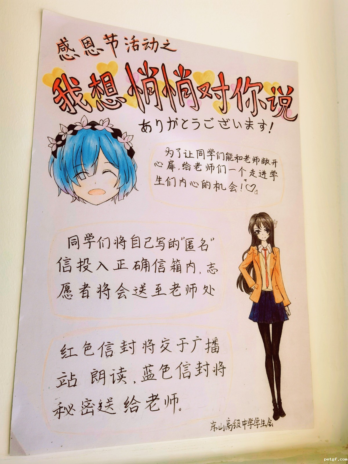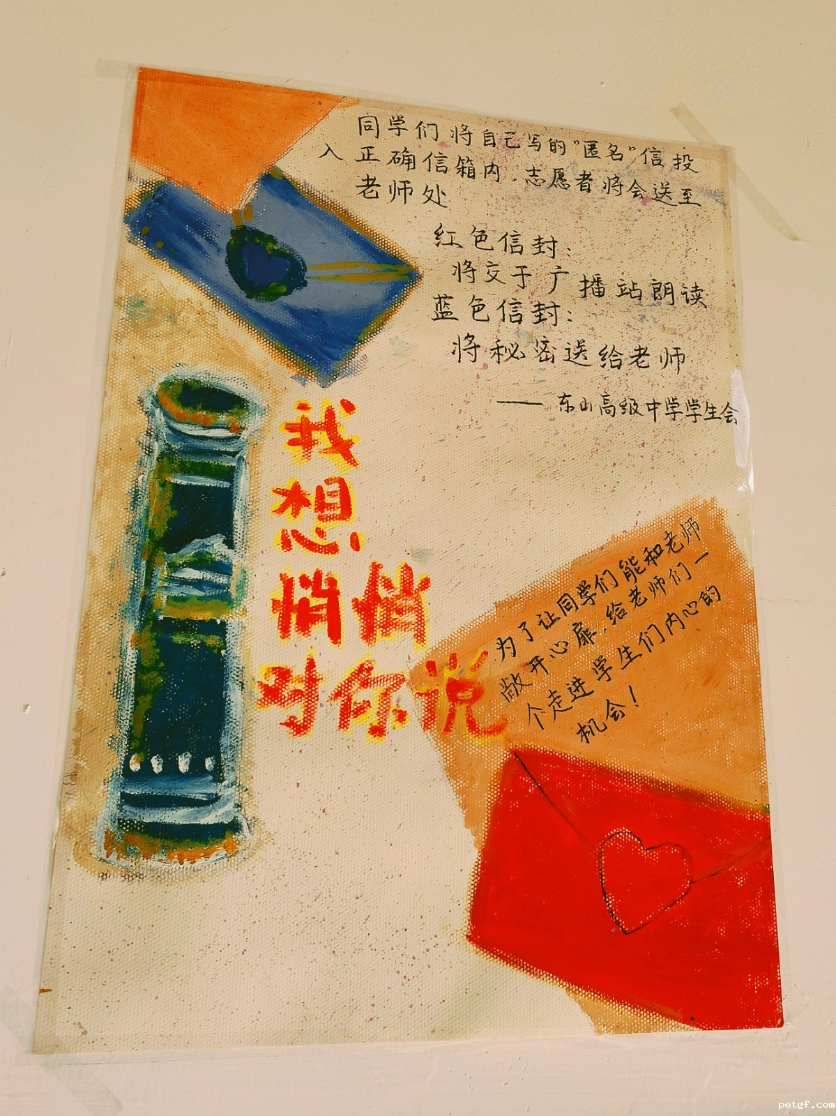 高中生在学校生活学习占据了他们大部分的时间,与教师的感情更是深厚、亲密又复杂。在日常的生活中,他们对老师一定有许多想说却不敢说,想说又不好意思说的贴心话和小建议。东山高中学生会号召同学们把想对老师说的话写在信纸上,投入特制的“悄悄箱”中,信件分为浅蓝色和粉红色两种。学生会志愿者们将同学们浅蓝色的信件秘密地送到指定老师的手中,粉红色的信件则会在校广播站朗读播报,在每天下午用电波的形式把同学对老师的爱意传递到校园的每一处角落。