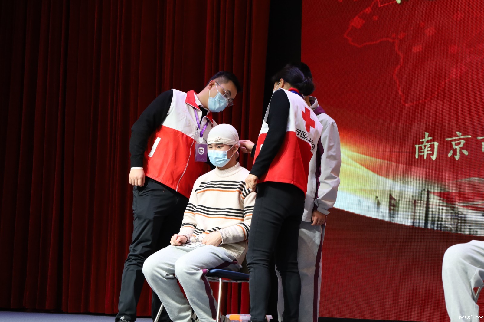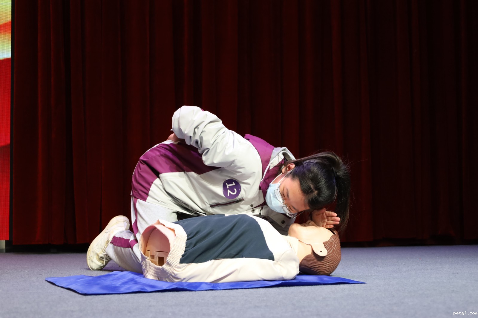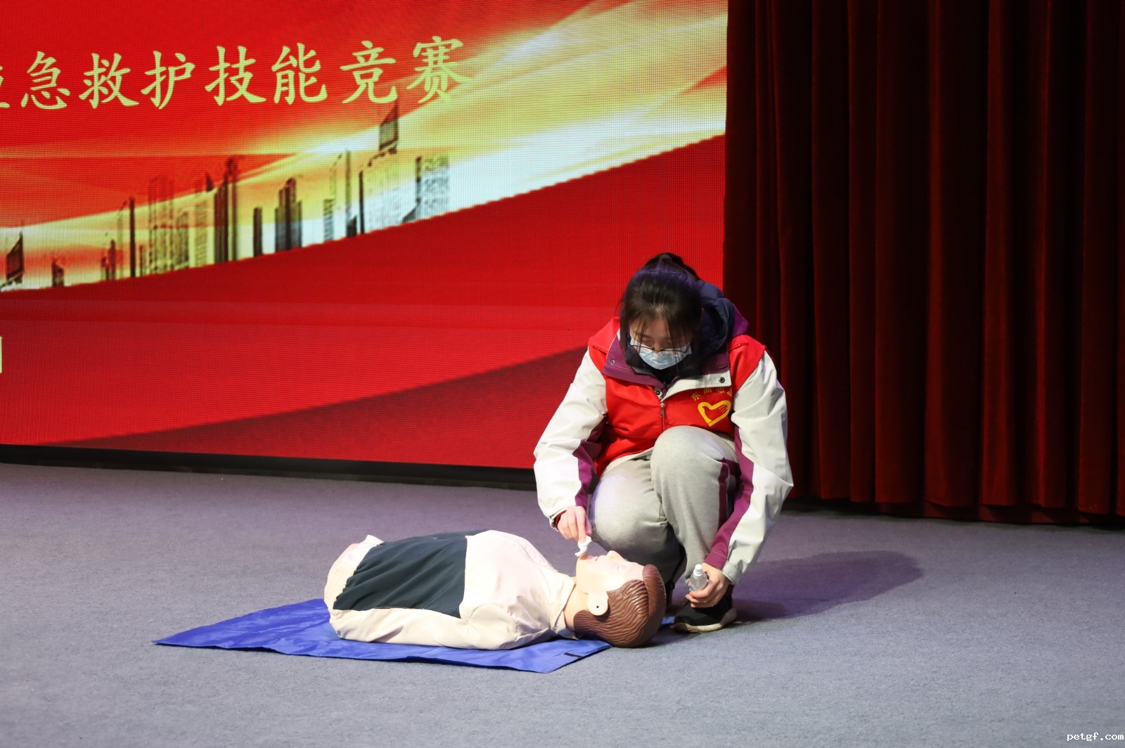 本次比赛分为心肺复苏和头部包扎两个大项。其中心肺复苏共有18位选手参加,先期通过抽签,从1到18号排序,每4人一组,共分5组,每人独立完成心肺复苏操作,现场计时员计时,评委分别打出分数,取平均分,按分数高低依次选出个人一二三奖项。接着我们以班级为单位进行头部包扎,评委进行打分,心肺复苏和头部包扎两项分数之和,按分数高低决出团体一二三等奖。